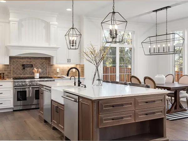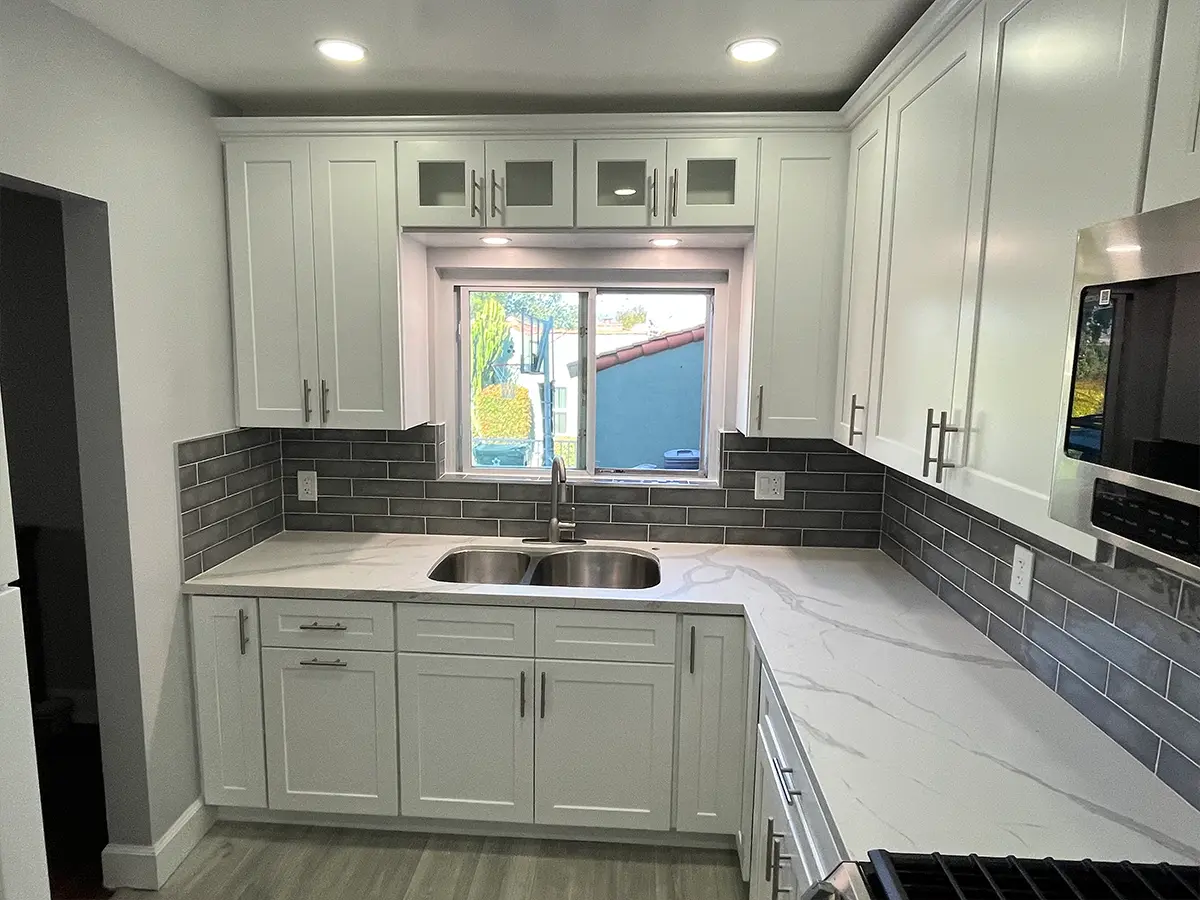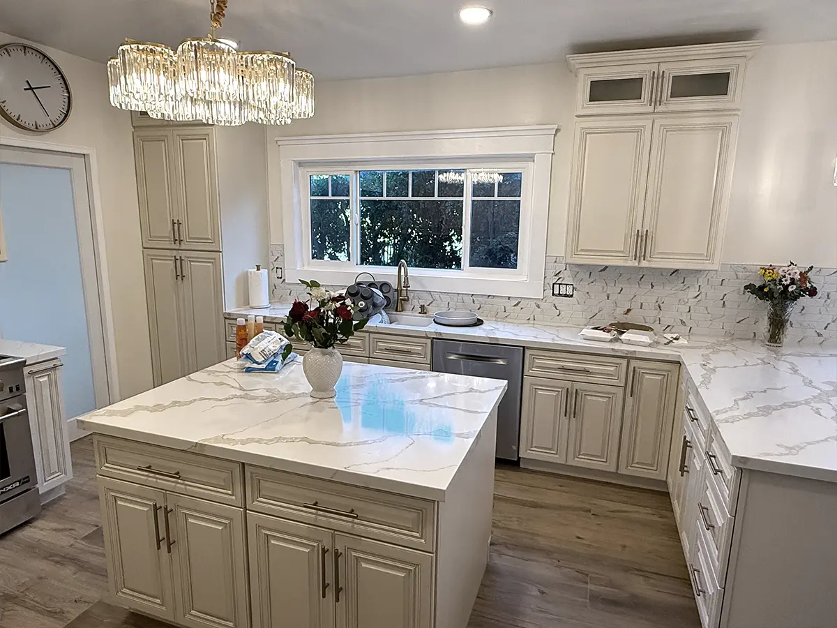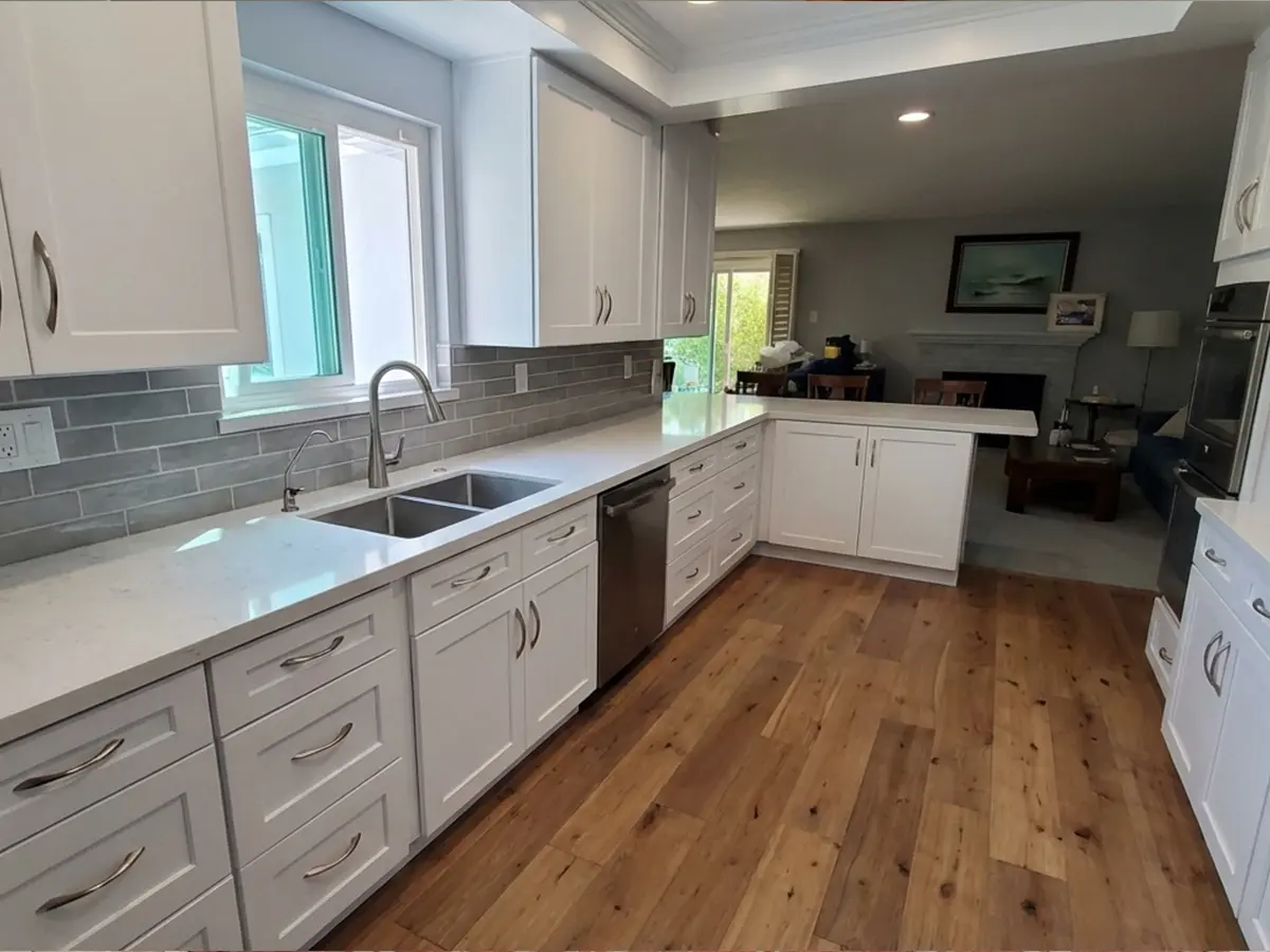 A full kitchen remodel with us covers demolition and debris removal, layout adjustments, new cabinetry, countertops, backsplash tile, flooring, lighting, plumbing fixtures, and all the finish details that pull it together.